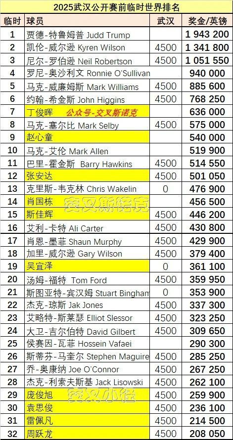 (1)奖金已含武汉公开赛资格赛奖金(4500英镑);“武汉”一栏,0代表该球员资格赛已经出局,空白代表该球员资格赛延期到正赛阶段。